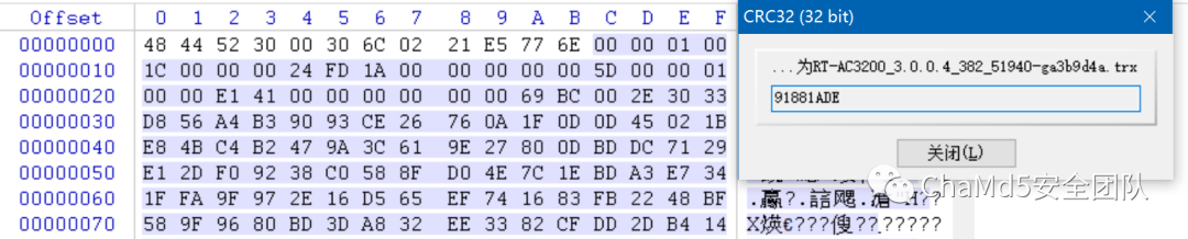 由此可知,check_crc应该就是检查的TRX头部的crc32字段,其中crc32字段存放的应该就是从flag_version至文件尾的CRCC校验值。我们这里拿winhex做一下计算,发现计算结果和crc32字段不一致,其实固件里存放的crc32字段是该计算结果取反后的。