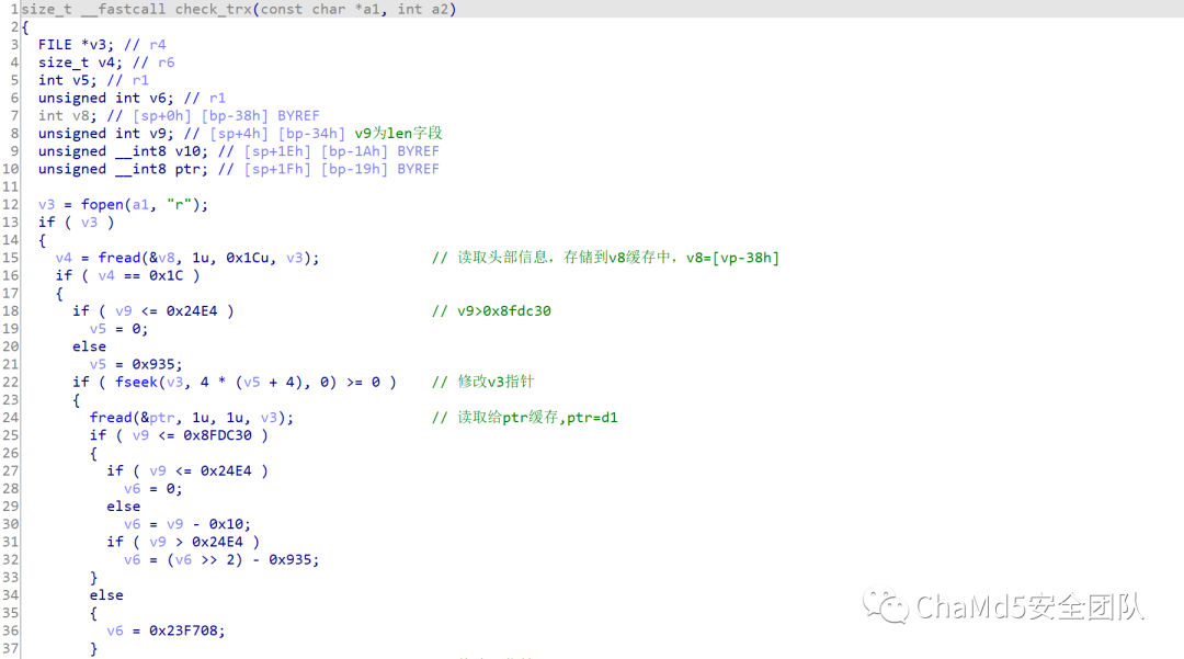 第二个校验函数为check_trx函数,虽然名为check_trx,经过分析发现其是华硕自己设计的检查尾部某个字节的函数。这个函数的功能如下,看到其首先检查了一下trx头是否可读。将trx头部信息读取到了v8缓存中,根据v8和v9的栈上的偏移,可以得出v9即为trx头部信息的第二个字段,长度字段。因此可以得出v9>0x8fdc30,之后在固件中,分别选取了两个位置的字节(0x24E4和0x8FDC30)进行了计算,并同固件中的某个位置的值做检查。简而言之就是计算得到的v10,和其中原本存放的位置a2做检查,看是否相等。