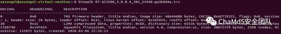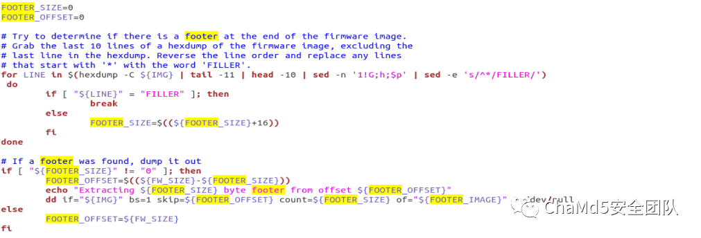 由binwalk扫描发现固件由3部分组成:TRX头、内核以及文件系统构成。再拿firmware-mod-kit也解包扫描一下,最终可以发现其实这个固件是由4部分组成,文件系统中包含FOOTER字段(其实FOOTER字段就是文件系统的一部分):