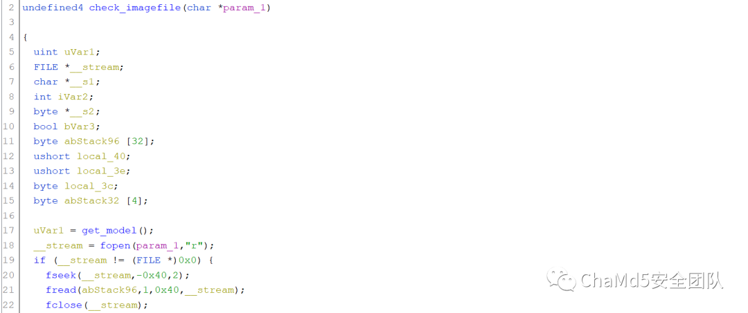 下面我们需要确定一下这个计算得到的字节,到底存放在固件的哪个位置,我们知道这个字节存放在a2参数中,因此查看他的父函数check_imagefile函数(图在前面粘过),发现在父函数中,对应的变量为v21。因此查看一下v21参数所在的栈位置。比较坑的是,在这里ida的解析出现了问题,解析出来了v3和v4两个指向FILE的指针,在这里结合Ghidra做一下分析: