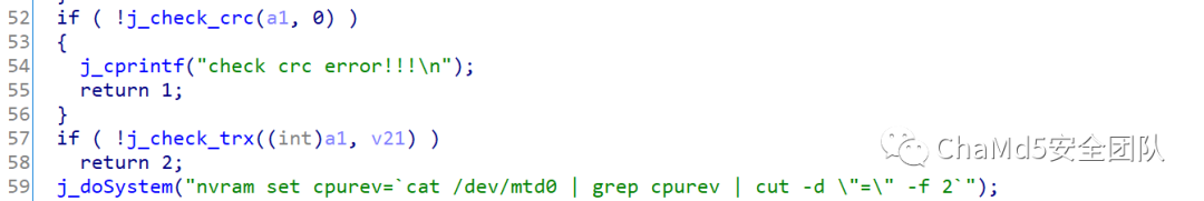 发现主要是对固件做了两个校验,分别是crc校验和trx校验。分别对这两个校验进行一下解析。首先看一下check_crc函数。其校验代码如下,作用即为检查trx头部的crc字段。