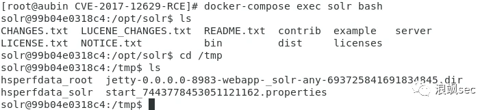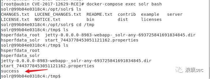 执行docker-compose exec solr bash进入容器,可见/tmp/success已成功创建: