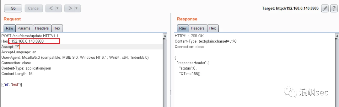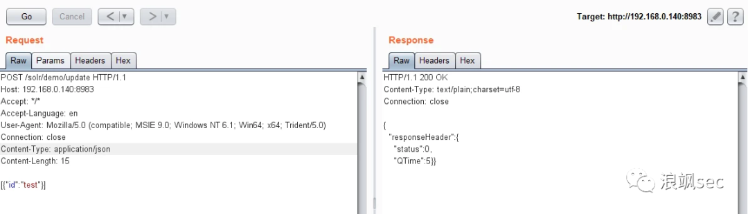 POST /solr/demo/update HTTP/1.1Host: 192.168.0.140:8983Accept: */*Accept-Language: enUser-Agent: Mozilla/5.0 (compatible; MSIE 9.0; Windows NT 6.1; Win64; x64; Trident/5.0)Connection: closeContent-Type: application/jsonContent-Length: 15[{"id":"test"}]