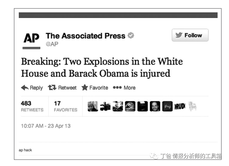 图 6. 来源:http://www.theverge.com/2013/4/23/4257392/ap-twitter-hacked-claims-explosions-white-housepresident-injured