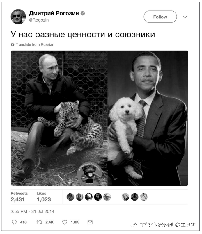 视觉内容有两个主要功能——给人留下深刻印象或使人沮丧。它很少具有纯粹的信息特性。有趣的是,幽默的图画和图片在心理战中发挥了重要作用。一个著名的例子是俄罗斯副总理德米特里·罗戈津(Dmitry Rogozin)在推特上发布的图片蒙太奇(见下文),说明了俄罗斯和美国的“不同的价值观和盟友”(原始推文:Y нас с а а а нн ст ти со о ик),这张照片相当受欢迎(转发2500次)。