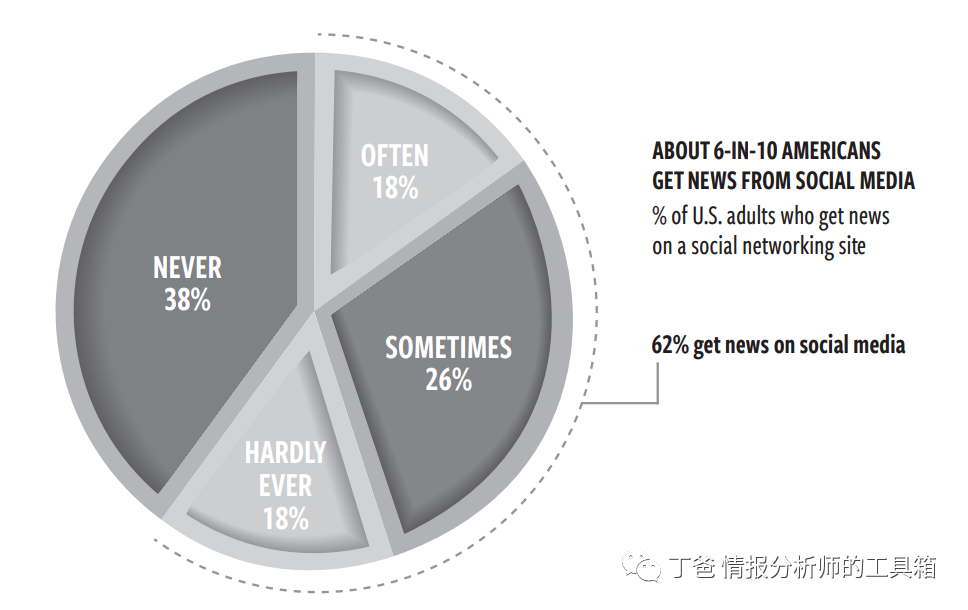 SWOCC(隶属于阿姆斯特丹大学传播学系的研究机构)的研究人员也观察到了这一趋势。他们在 2016 年进行的研究表明,用户对社交媒体的看法发生了很大变化。一些平台被认为不那么“社交”,而更“信息丰富”(例如 Twitter)。皮尤研究中心 (Pew Research Center) 于 2016 年开展的其他研究得出的结论是,62% 的美国成年人从社交媒体获取新闻。增长趋势似乎很明显,在 2012 年,这个数字是 49%。
