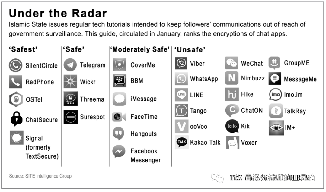 防御——旨在保护特定社交网络免遭对手渗透的各种活动。这包括加密、反跟踪、IP 隐藏或上述自适应结构的使用等活动。Joseph Shaheen 将这种技术描述为一个 DEER 过程:传播(公共宣传);删除或暂停帐户(由对手);(网络)结构或方法的演变;扩大影响力或方法;账户和资源的补充。防御还意味着通过不同的社交媒体平台进行交流,让社交媒体用户意识到他们遇到的风险。此类“指示”的一个例子是 Daesh 于 2016 年 1 月发布的指南(见下表),其中明确指出了 Daesh 追随者认为“安全”和“不安全”的平台。