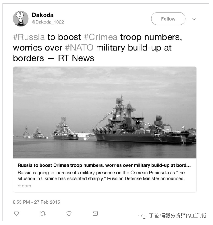 (地理)定位——探索虚拟现实(在这种情况下,社交媒体),以确定在现实世界中进行军事行动的目标。这种分析使用带有地理标记的图片、用户对话的内容和地理定位数据。不同的参与者很早就认识到了地理定位的风险。例如,2014年,“伊拉克和黎凡特伊斯兰国”(ISIL)或“达伊沙”(Daesh)禁止其圣战者开启原来的推特地理标签功能。