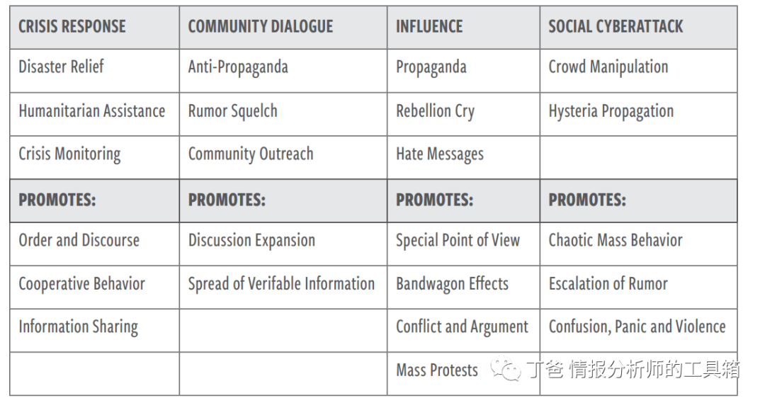 因为,除了其货币化潜力之外,社交媒体还成为在现实世界中动员支持、传播叙事、发动信息行动,甚至协调军事行动的绝佳渠道。国家和非国家行为体已开始广泛使用社交媒体来影响其目标受众的认知、信念、观点和行为。尽管社交媒体一直是支持合法和有价值的行动(例如在灾区的人道主义援助)的非常有用的沟通渠道,但它越来越多地用于其他远不那么崇高的目标。下图来自 Rebecca Goolsby 博士关于社交网络攻击的文章 ,显示了社交媒体对话如何用于不同目的。