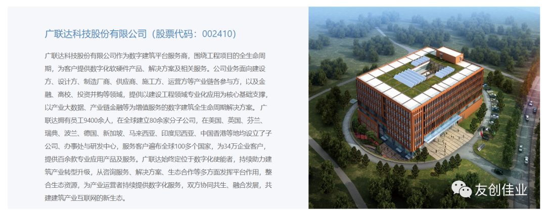 广联达是一家拥有6大研发中心、80余家分子公司、1100余件软著证书、9000余名员工、400多项奖项、34万家企业客户的数字建筑平台服务商。
