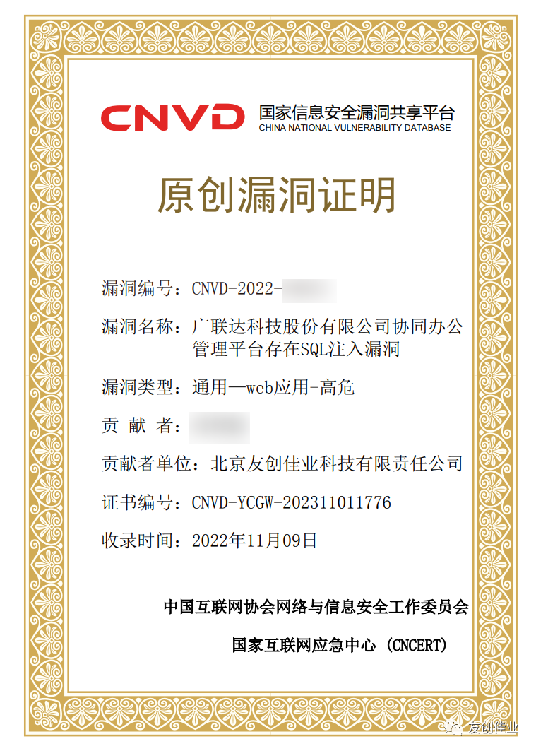 友创佳业安服团队监测发现广联达协同办公管理平台存在0day漏洞,本次漏洞预警不公布漏洞细节,以防被恶意利用,请相关用户及时联系服务商进行漏洞核实、修复,相关漏洞已经提交CNVD(国家信息安全漏洞共享平台)和CNCERT(国家互联网应急中心)。