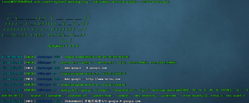 2、自定义添加扫描域名,并对这些域名进行漏洞扫描,文件名为厂商名称,文件内存放需扫描域名,需提供--offer-bounty参数,设置域名是否提供赏金。