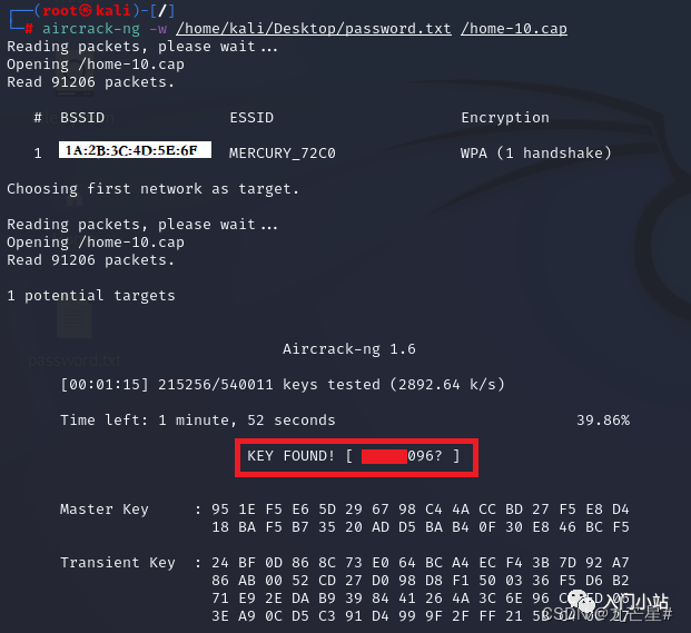 aircrack-ng -w /home/kali/Desktop/password.txt /home-10.cap注:password.txt 社工字典