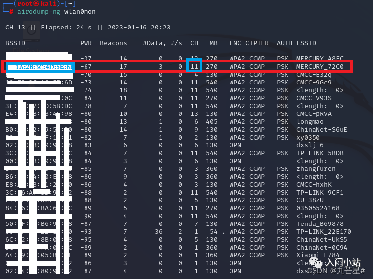 这里我们记下要破解 WiFi 的 BSSID 和信道,下图中我用蓝色标记。当搜索到我们想要破解的 WiFi 热点时可以 Ctrl+C 停止搜索。