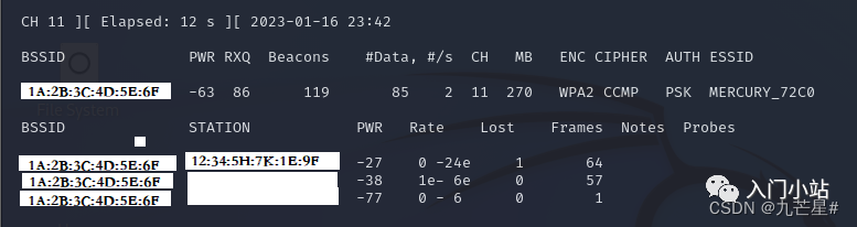 使用 airodump-ng 命令列出无线网卡扫描到的 WiFi 热点详细信息,包括信号强度,加密类型,信道等。