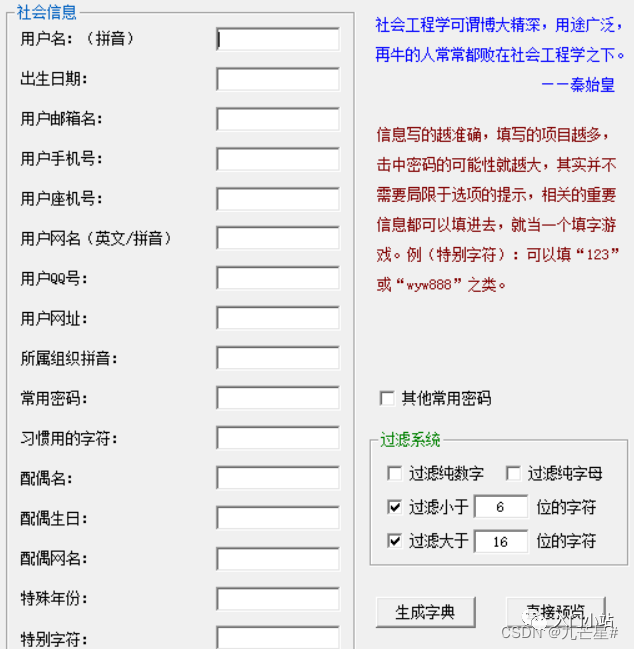 而社工字典,是通过我们输入攻击目标的一些关键信息,经过社会工程学的分析,可以针对该目标生成定制化的字典。