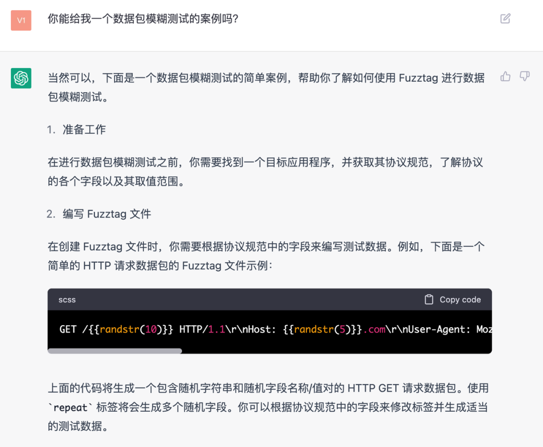 可以问它,“你能编写一个数据包模糊测试的案例吗?”这样便可以检验我们的“咒语”是否生效了。