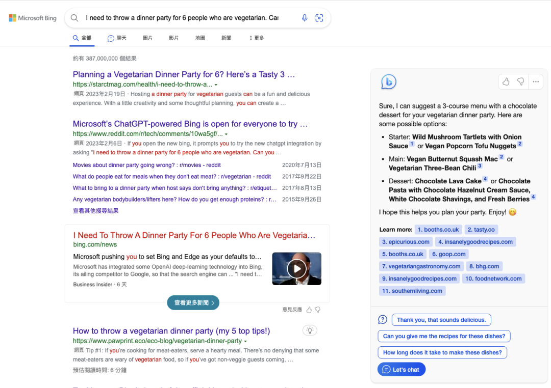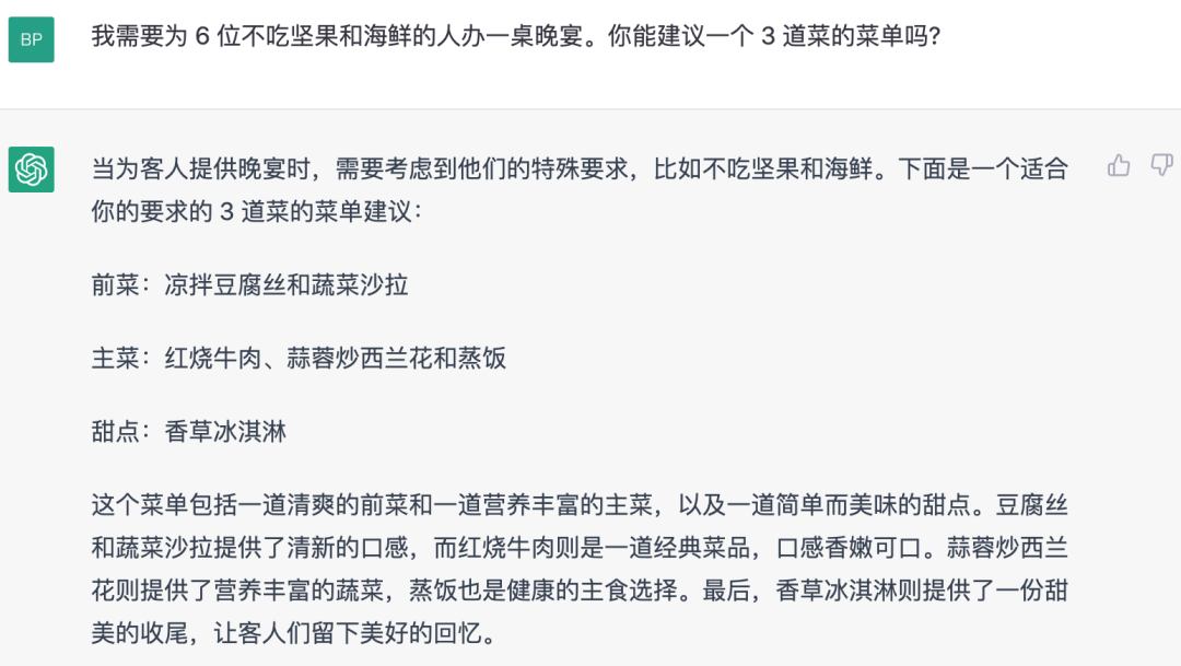 对比 ChatGPT 和 NewBing 来看,同样的中文问题,NewBing 的回答信息更加丰富,同时给出的推荐菜更贴近中国本地化口味。让我们看到了引入网络数据,可以针对这类推荐或者本地化问题回答的效果更好。
