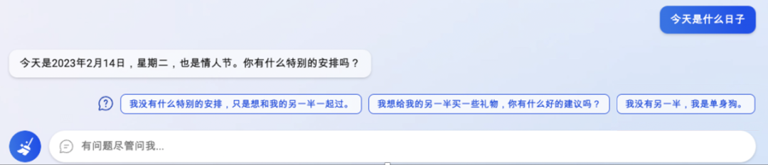 如下图案例所示,上面是 22 年 ChatGPT 发布初期的回答,缺陷很明显回答为 21 年日期,后面 ChatGPT 做了一些规则不回答此类问题。后面的图为 NewBing 结果,因为可以获取实时信息数据,可以准确的回答 2023 年 2 月 14 日星期二,并且还给了一些引导性问题。