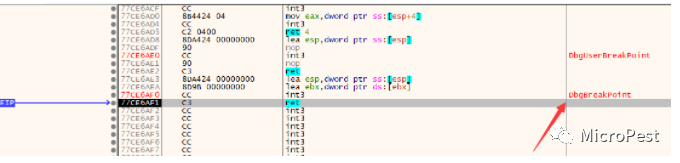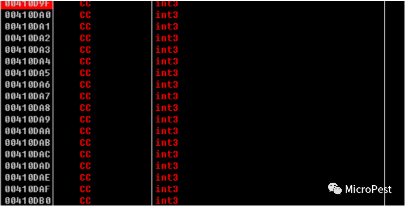 这里就突然发现,针对于这里打断点的地址的值其实并不是od里面的那样的,是被改动了的,第一个字节的内容是被CC填充了的,在触发CC指令时就会触发异常,然后这里正好捕获。