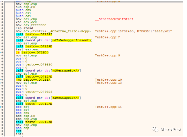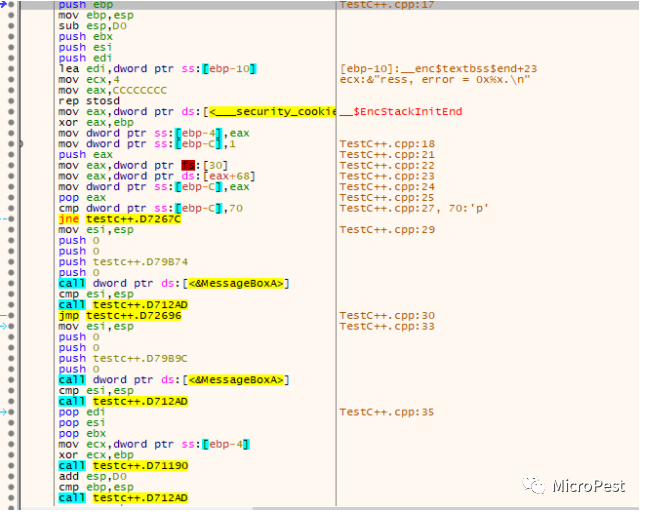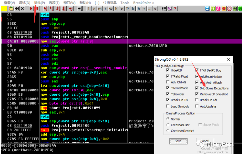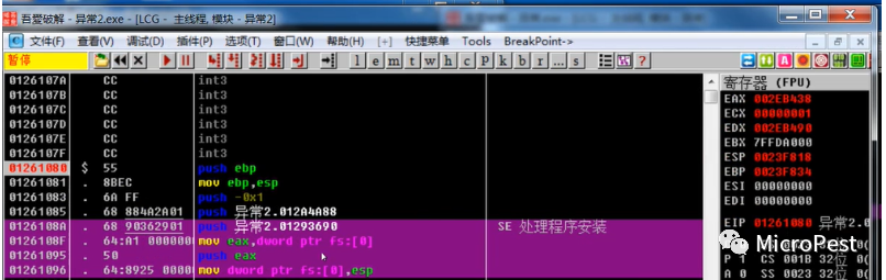 OD中的按F2可以产生一个断点,根据断点的原理可以猜到,这里肯定是用了什么手脚产生了一个异常,然后调试器捕获了才停到了这里。