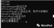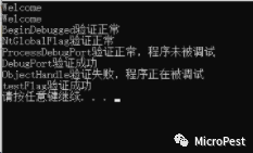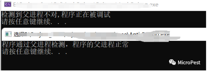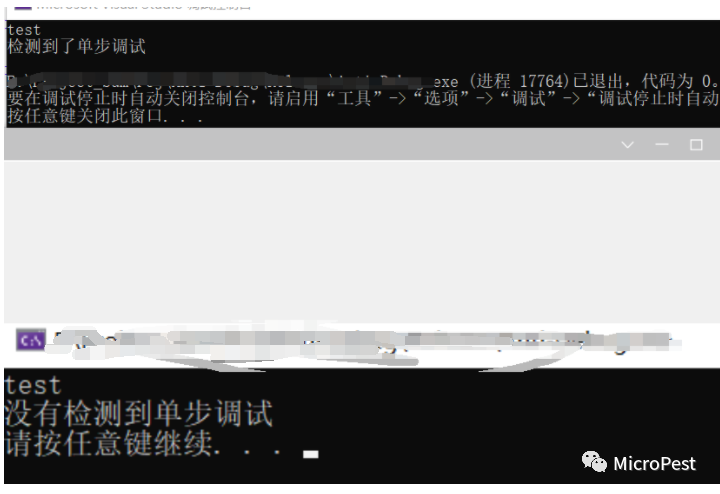 再加上出现了异常如果有调试器就会返回给调试器,如果调试器继续往下走也没啥问题,因为我们这里的异常代码是一个nop,而一个普通运行的进程因为没调试器,所以就会走异常处理程序,所以就是走异常处理程序的就是正常进程,没走的就是异常。