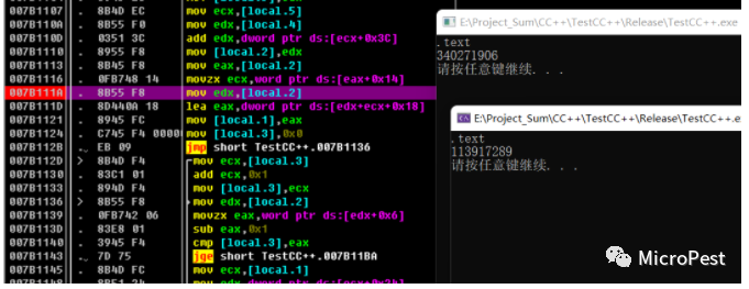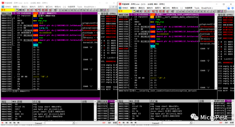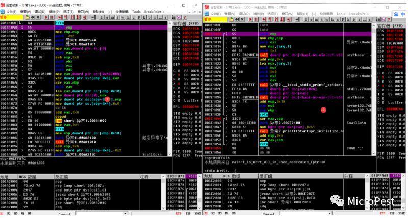 生成两个程序观察,两个程序的区别就是一个有异常SEH,一个没有