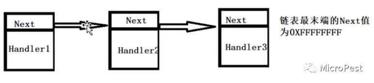 } EXCEPTION_REGISTRATION_RECORD;SEH在程序中实际上是以链表形式存在,每一个next都指向下一个SEH,这个链表也叫SEH链(如图):