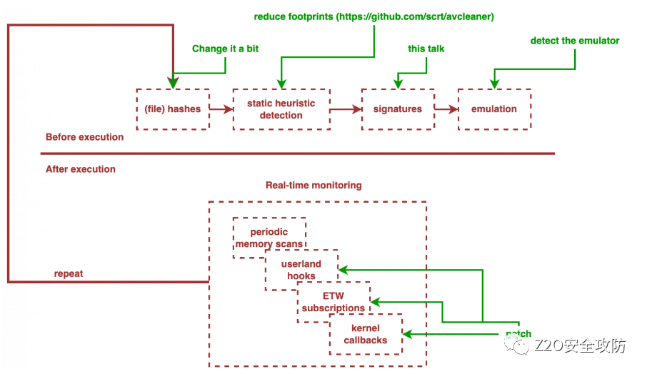 动态检测:保留整个代码库,但在某个地方插入一个无限循环,这样程序就真的是良性的。如果文件仍然被检测到,那么检测就会发生,因为防病毒软件由于一些静态可用的特征而简化了它的分析。如果不是,则在有效负载执行时进行检测。