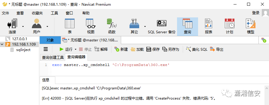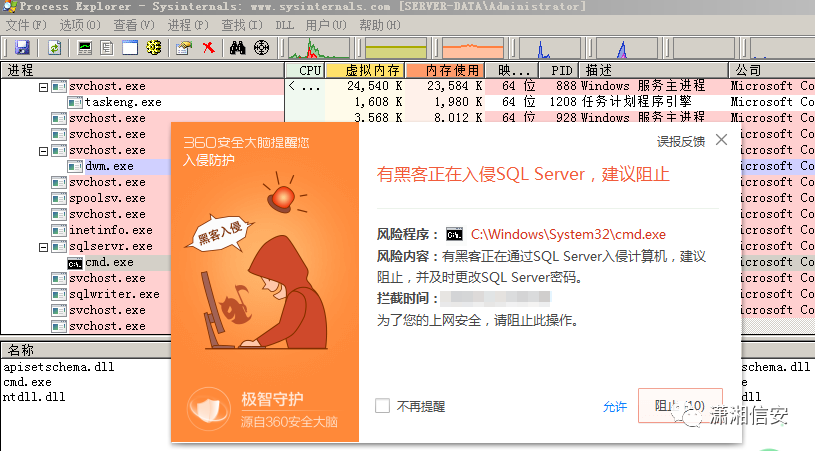 sqlmap也一样,xp_cmdshell都是在sqlservr.exe进程下起一个cmd.exe子进程来执行命令和程序的,这也就是360拦截原因,检测了sqlservr.exe进程链。
