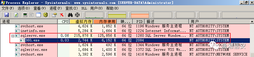 这里可以看到CLR这种利用方式也不是调用cmd.exe执行的,没有创建任何子进程,而是直接运行在sqlservr.exe进程下了,所以360不会对其拦截!!!