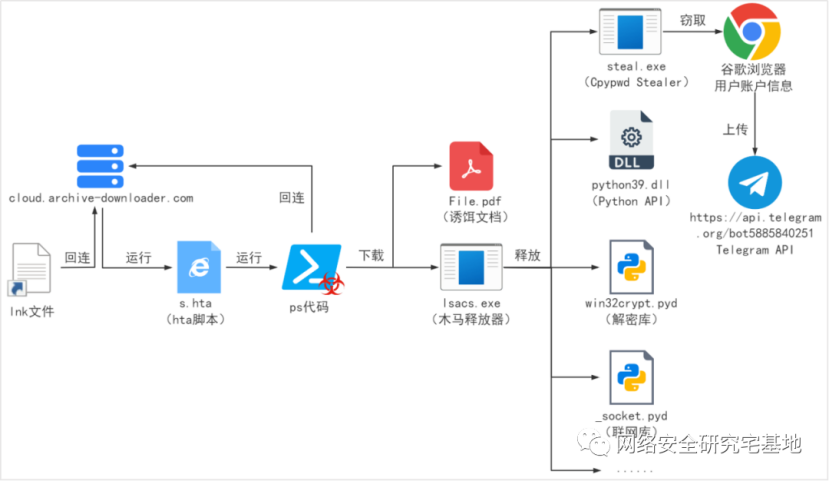 近期,安恒在威胁狩猎中发现一批样本使用新型窃密软件针对东欧、中亚地区国家发起了钓鱼攻击。研究人员将此次攻击的背后组织标为内部代号“APT-LY-1006”以做后续追踪。本次活动以包含lnk文件的zip压缩包为载体,攻击者疑似通过钓鱼邮件投递至政府部门。受害者运行lnk文件后将首先访问远程hta脚本,hta脚本则会通过Powershell命令从C2服务器处获取诱饵文档“File.pdf”和释放器“lsacs.exe”。其中,受害者打开诱饵文档的同时将运行lsacs.exe,该程序主要用于释放窃密程序载荷:steal.exe。steal.exe(CpypwdStealer)由C++编写,其加载恶意代码的方式采用了罕见的调用Python/C API的形式,并且编译器版本信息显示为发布不久的Microsoft Visual C/C++(2022 v.17.4)。此外,研究人员表示目前捕获样本与Kasablanka组织存在一定的弱关联:1)本次披露的ip地址与曾披露的Kasablanka组织的ip地址接近;2)Kasablanka初期加载载荷的过程中使用了与本次捕获样本中另一种攻击方式相似的代码;3)本次样本释放的Warzone RAT木马回连ip关联样本出现了曾披露的Kasablanka组织的后门。攻击链图如下图所示。