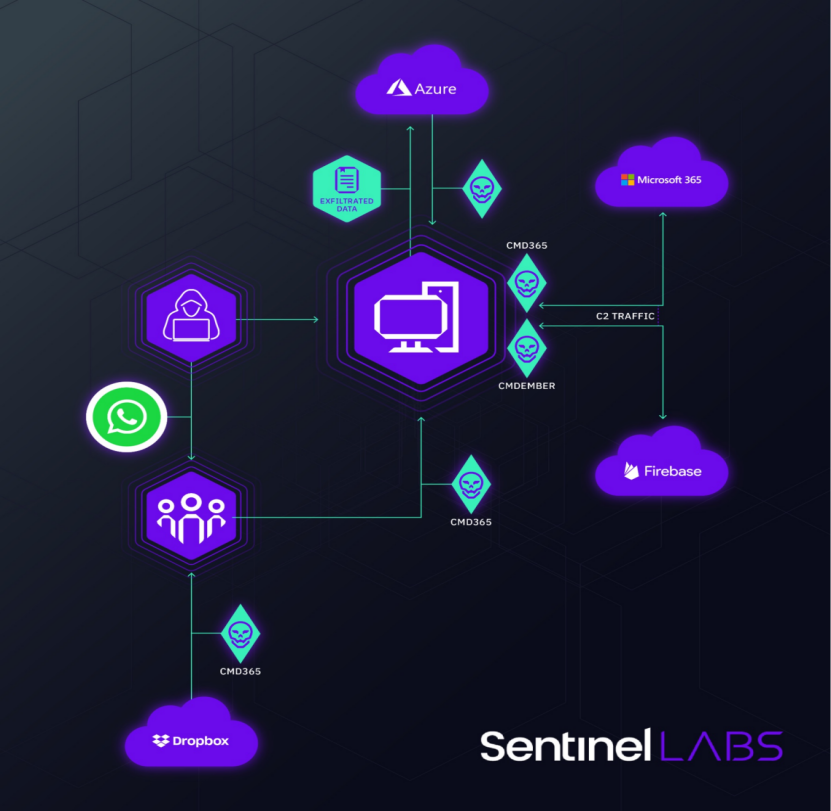 近日,Sentinelone的安全研究人员披露了新发现的APT组织WIP26,长期针对中东的电信运营商开展网络间谍活动。根据研究人员分析,WIP26的重要特点之一为严重依赖公共云基础设施:将Microsoft 365 Mail、Microsoft Azure、Google Firebase和Dropbox用于恶意软件投送、数据泄露、命令与控制,试图通过此方式使恶意C2网络流量看起来合法,从而躲避检测。WIP26攻击活动的感染链通常始于包含指向恶意软件加载程序的Dropbox链接的WhatsApp消息,攻击者通过精确定位攻击目标的员工,诱骗其下载和执行恶意软件,并最终在受害者的系统上部署利用Microsoft 365 Mail和Google Firebase作为C2信道的两种后门木马(命名为CMD365和CMDEmber)。此外,后门木马CMD365和CMDEmber还会进一步诱导用户下载伪装成例如PDF编辑器或浏览器等实用软件,以执行远程命令。WIP26使用的云基础设施的使用如下图所示。