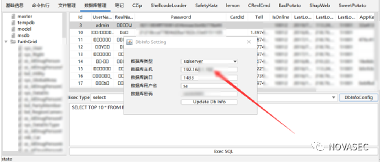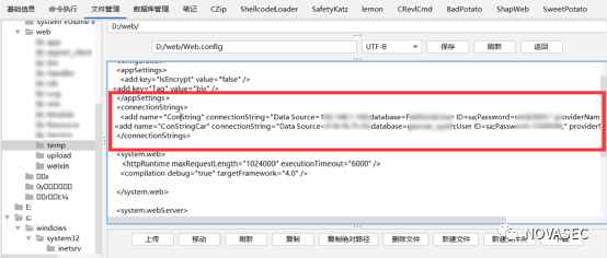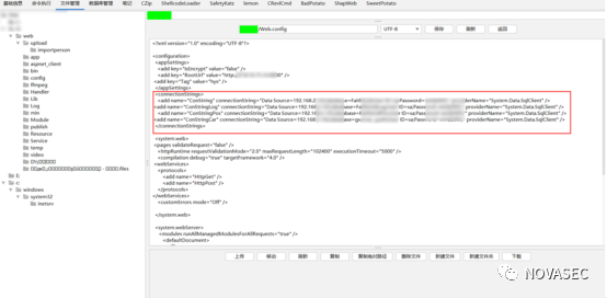 查找服务器文件获取到数据库账号密码,通过webshell可直接对内网数据库进行管理和操作,后续的内网MSSQL命令执行就不说了。