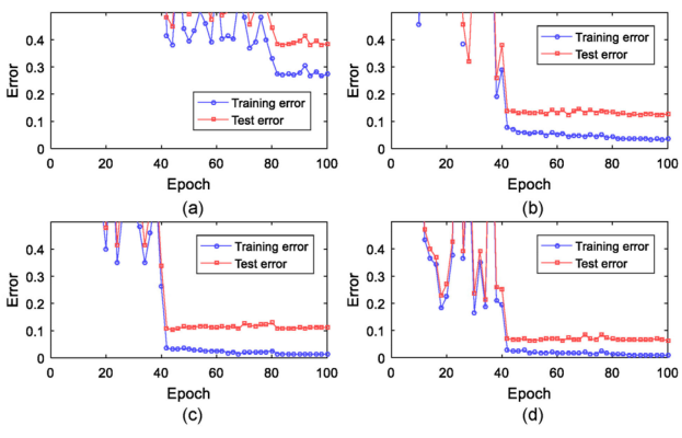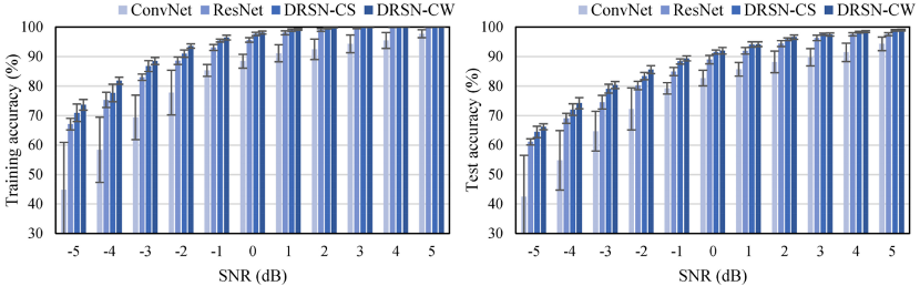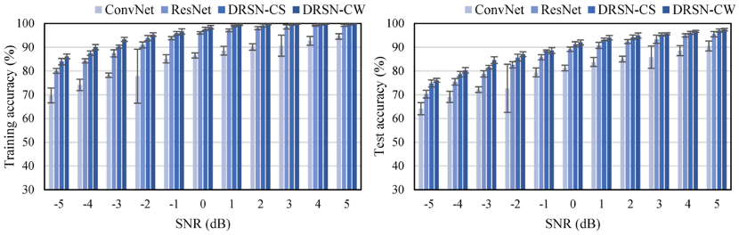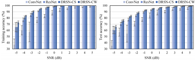 从图12可以看出在高噪环境下DRSN-CW错误率更低。与DRSN-CS相比,DRSN-CW的精度更高的一个直接原因是特征图的不同通道往往包含不同数量的噪声相关信息。因此,DRSN-CW可以应用不同的阈值来收缩特征图的不同通道上的特征,比DRSN-CS对特征图的所有通道应用一个通用的阈值更灵活。因此,开发的DRSN-CW可以更有效地消除噪声相关信息,可以产生比DRSN-CS更高的精度。
