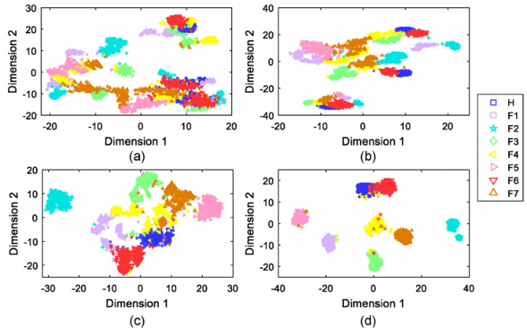 如图13(a)和(b)所示,不同健康条件下的测试观察结果在CNN和ResNet中高度混合在一起。一些状况(如F6)的观测分布在几个不同的区域,因为振动信号是在不同的操作条件下采集的,具有不同的特征。CNN和ResNet不能将它们投射到相同的区域。相反,如图13(c)和(d)所示,在DRSN-CS和DRSN-CW中,相同状况的样本的观察结果大多集中在同一区域,也基本上与其他状况的观察结果分离。原因是在深层架构中集成软阈值作为收缩函数,可以降低噪声相关特征,从而使最后一层的高层特征更具辨别能力。