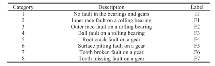 本文仿真中所使用的故障数据集由下图传动系统诊断模拟器采集得到,该模拟器主要由电机、两级行星齿轮箱、两级定轴齿轮箱和可编程磁制动器组成,共包含无故障(H)、滚动轴承内圈故障(F1)、滚动轴承外圈故障(F2)、滚动轴承滚珠故障(F3)、齿轮根部裂隙(F4)、齿轮表面坑洞(F5)、齿轮齿断裂(F6)和齿轮缺失(F7) 8种健康状态。