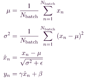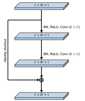 残差单元由两个批归一化层,两个ReLU激活层,两个卷积层和一个恒等映射组成。它这样设计的一个思想是假如中间这两层卷积一点东西都没学到,通过这个恒等映射可以保证输出的东西不会比之前学到的差。批归一化的主要作用是保证输入数据分布的相对稳定,加快模型收敛。批归一化计算公式如下: