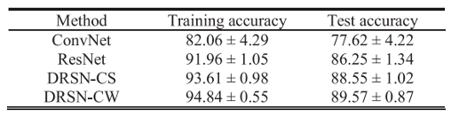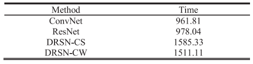 从图10可以看出,DRSN-CW比DRSN-CS在平均准确率上提高了1.02%,主要是因为不同通道的特征图通常包含不同数量的噪声相关信息,DRSN-CW可以应用不同的阈值对特征图的不同通道中的特征进行缩小,比DRSN-CS更灵活,更有效地消除噪声相关的信息。从计算时间上来看,DRSN-CS和DRSN-CW由于多了阈值计算,比ResNet多了很多计算时间,DRSN-CW时间小于DRSN-CS主要是由于少了一个平均计算。