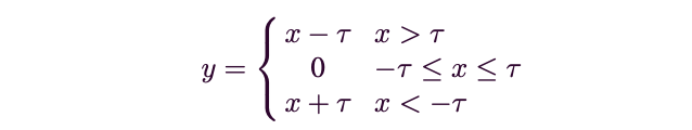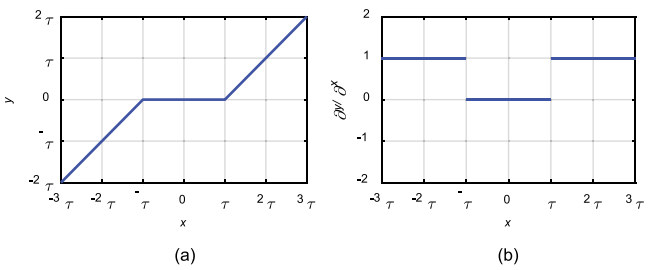 式中x为输入特征,y为输出特征,τ为阈值,即为正参数。在ReLU激活函数中,软阈值不是将负特征置零,而是将接近零的特征置零,这样就可以保留有用的负特征。软阈值处理过程如下图(a)所示。可以观察到输出对输入的导数要么为1要么为零,这可以防止梯度消失和爆炸问题,如下图(b)所示。导数可以表示为: