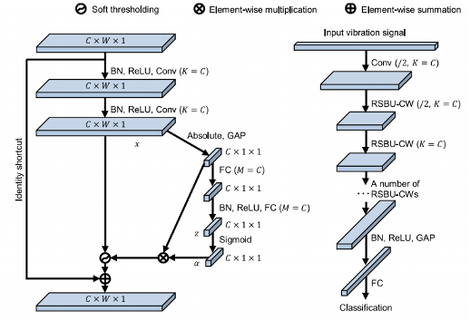 为了提高对高噪声振动信号的特征学习能力,实现较高的故障诊断精度,本文提出了一种名为深度残差收缩网络新的深度学习方法。在深层结构中插入软阈值作为非线性变换层,以消除不重要的特征。此外,考虑到阈值的合理取值通常依赖专家经验,本文方法还集成了神经网络作为可训练模块来自动确定阈值,从而不需要信号处理方面的专业知识。