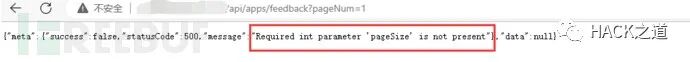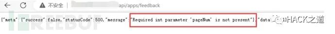 是这样一个数据包,也没有注入点之类的,感觉没啥东西啊,想着就把/api/apps/feedback这个直接拼接到url上看看,因为看到api就会让人想到信息泄露之类的。拼接上去之后,告诉我缺少pageNum这个参数,我把这个参数拼接上去。