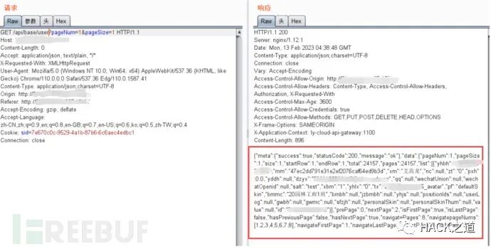 然后我修改pageNum和pageSize这两个参数的大小,结果测试后pageNum=1,2,3,4,5和pageSize=1000的时候,分别泄露不同的一千个人的信息,pageNum后面的数字超过5之后,就没有信息了(这个学校的学生可能就这么多了)。并且pageSize后面的数值太大会造成超时。