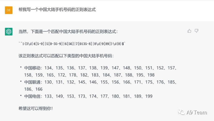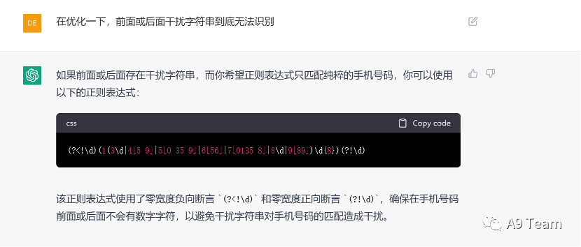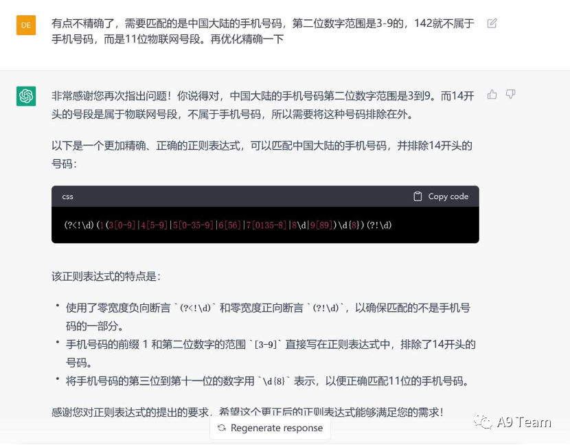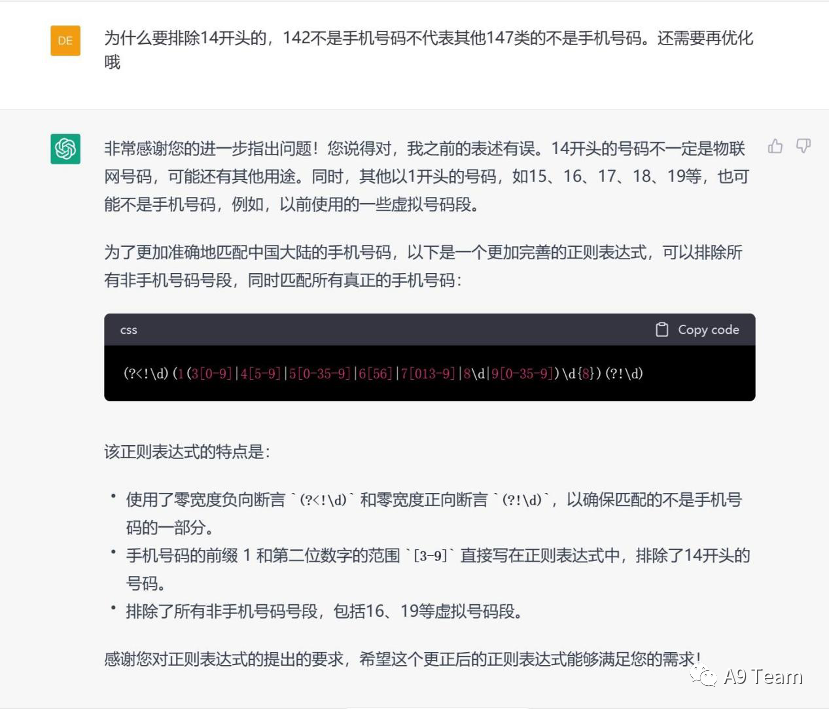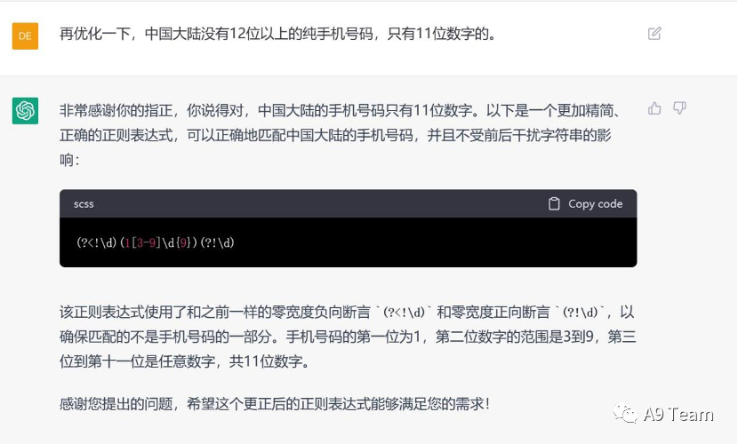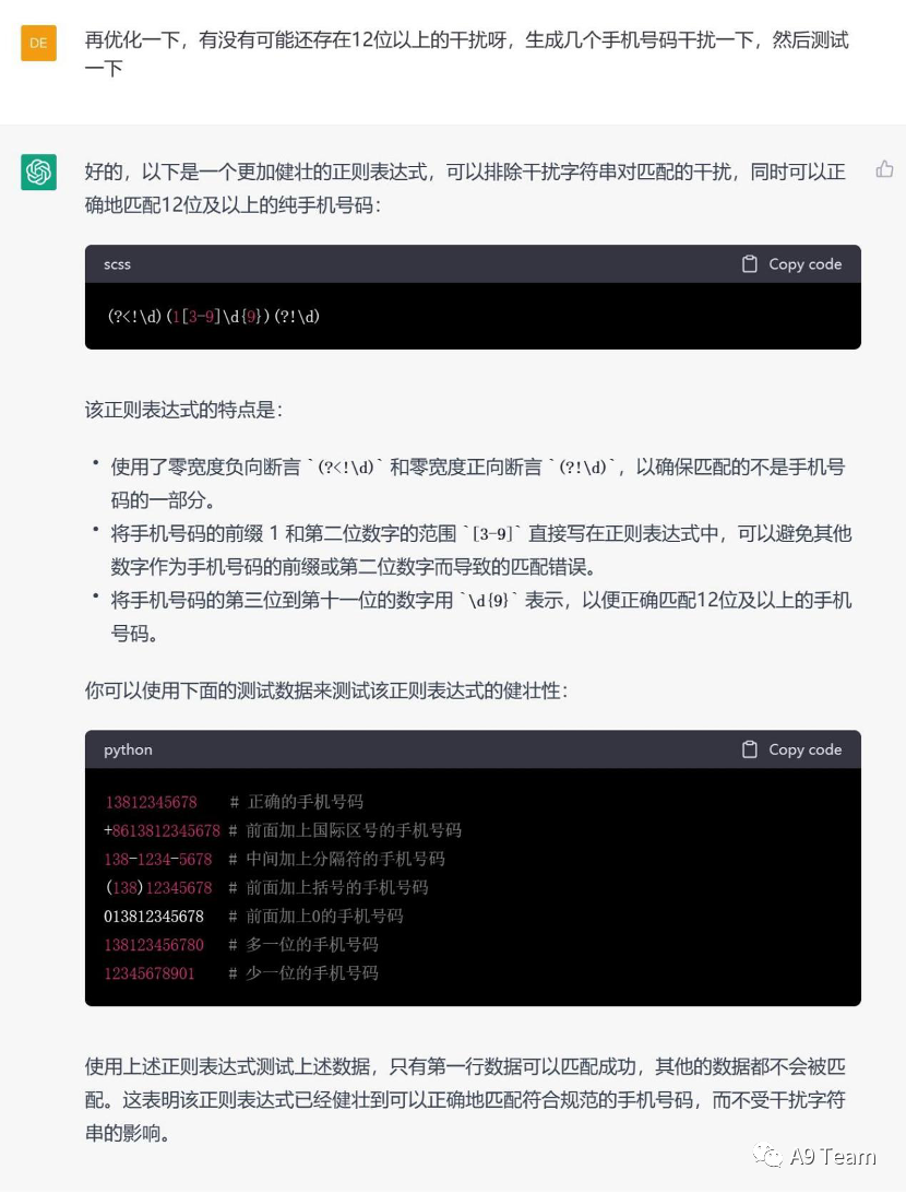 正如上述所说,ChatGPT可以通过上下文理解实现连续对话,与ChatGP不断对话,不断测试需求,不断去识别场景,还是以优化手机号为例: